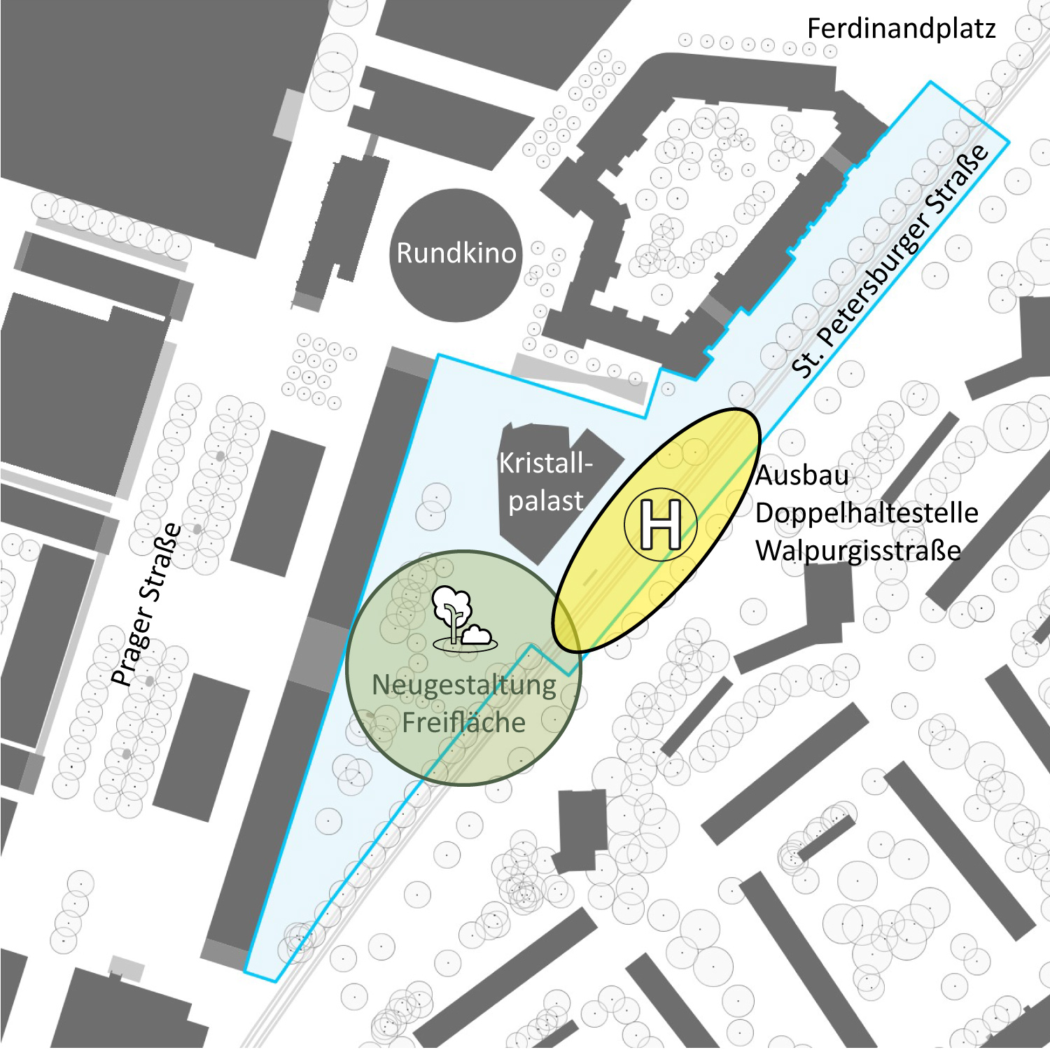 - Um eine attraktivere Wegeverbindung für Fußgänger von der Haltestelle Walpurgisstraße in Richtung Prager Straße zu gestalten, soll die höher gelegene Platzfläche umgestaltet werden.