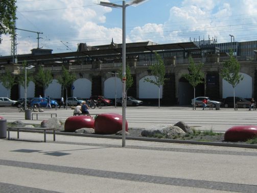 - Der Übergangsbereich zwischen dem südlichen Haupteingang des Bahnhofs Mitte und der Straßenbahn-/ Bushaltestelle sollte als qualitativ hochwertiger Aufenthaltsort für die verschiedenen Nutzer gestaltet werden.