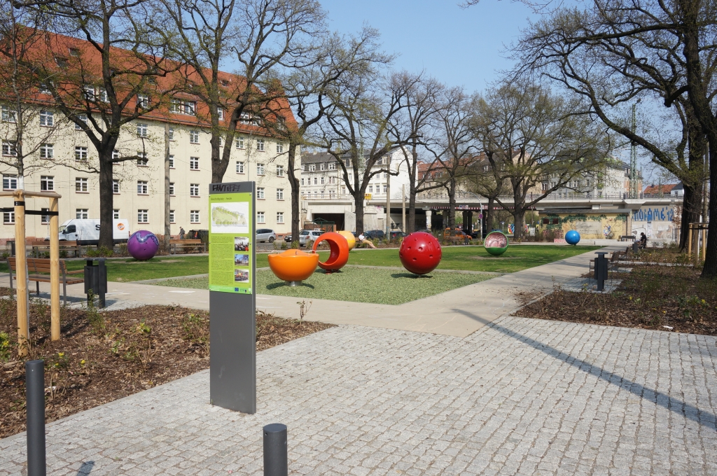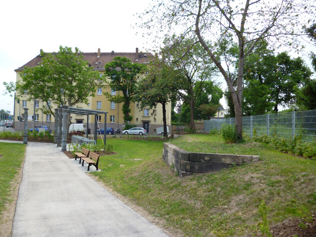 Mit dem Anlegen der öffentlichen Grünfläche auf etwa 650 Quadratmetern im hinteren Teil der Brachfläche wurde eine qualitativ hochwertige Eingrenzung der Gesamtfläche geschaffen. Zu den Bahnanlagen hin wurde ein ein Meter hoher Erdwall aufgeschüttet, mit Rasen angesät sowie mit Bäumen und Sträuchern bepflanzt. Somit konnte eine natürliche Grenze zu den direkt anliegenden Bahnanlagen gebildet werden. Die als sandgeschlemmte Wegedecke geschaffene Erschließung der Brachfläche dient nicht nur der öffentlichen Grünfläche sondern auch dem Projekt Mehrgenerationengarten „Aprikosen für ALLE".