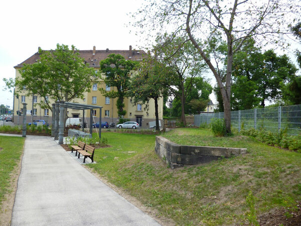 Seit fast zwei Jahren trägt der im rückwärtigen Bereich der Brachfläche angesiedelte Mehrgenerationengarten „Aprikosen für ALLE" zur Belebung und Aufwertung der Fläche bei. Mit der Schaffung der an die Bahnfläche angrenzenden Grünfläche erfährt das Wohnumfeld eine weitere Aufwertung und stärkt die Funktionsfähigkeit dieses Areals. Mit der Maßnahme sollte die Zugänglichkeit zum Grundstück und die Abgrenzung der Fläche nachhaltig verbessert werden. Die Schaffung von dieser Grün- und Freiflächen trägt außerdem zur Klimaverbesserung bei und wertet das unmittelbare Wohnumfeld auf.