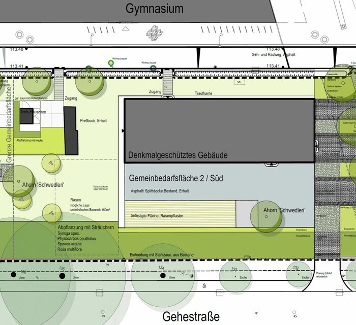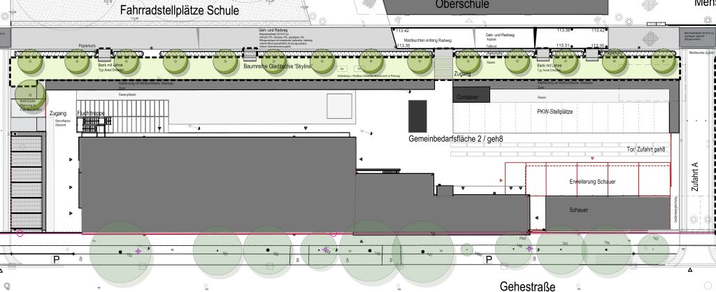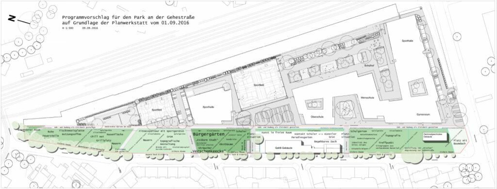 Gleichzeitig besitzt die Grünanlage durch die Anlage eines Geh- und Radweges eine wichtige Erschließungsfunktion für den Schulkomplex und dient als Puffer zwischen der Schulfunktion und dem Wohnbereich an der Gehestraße.