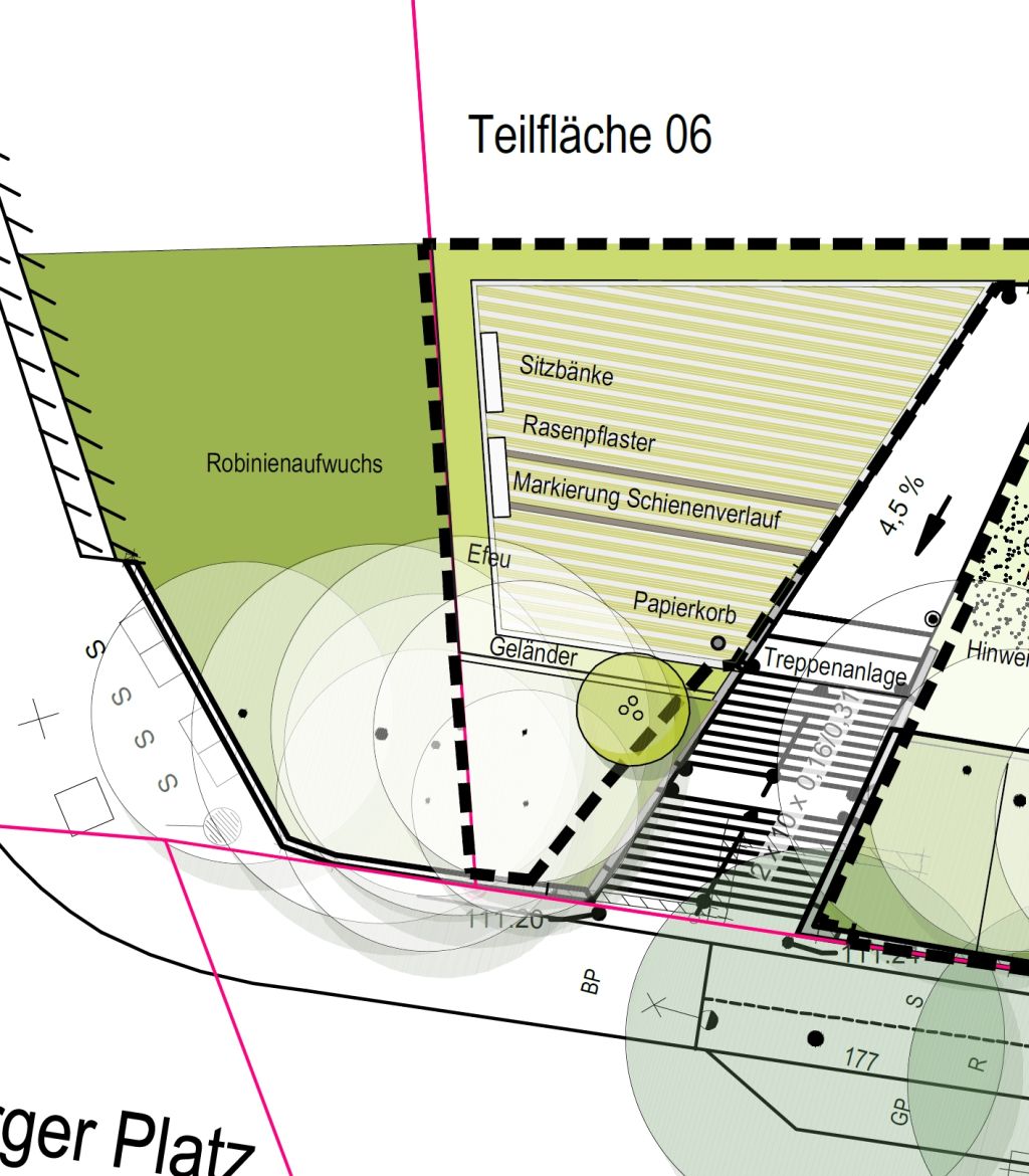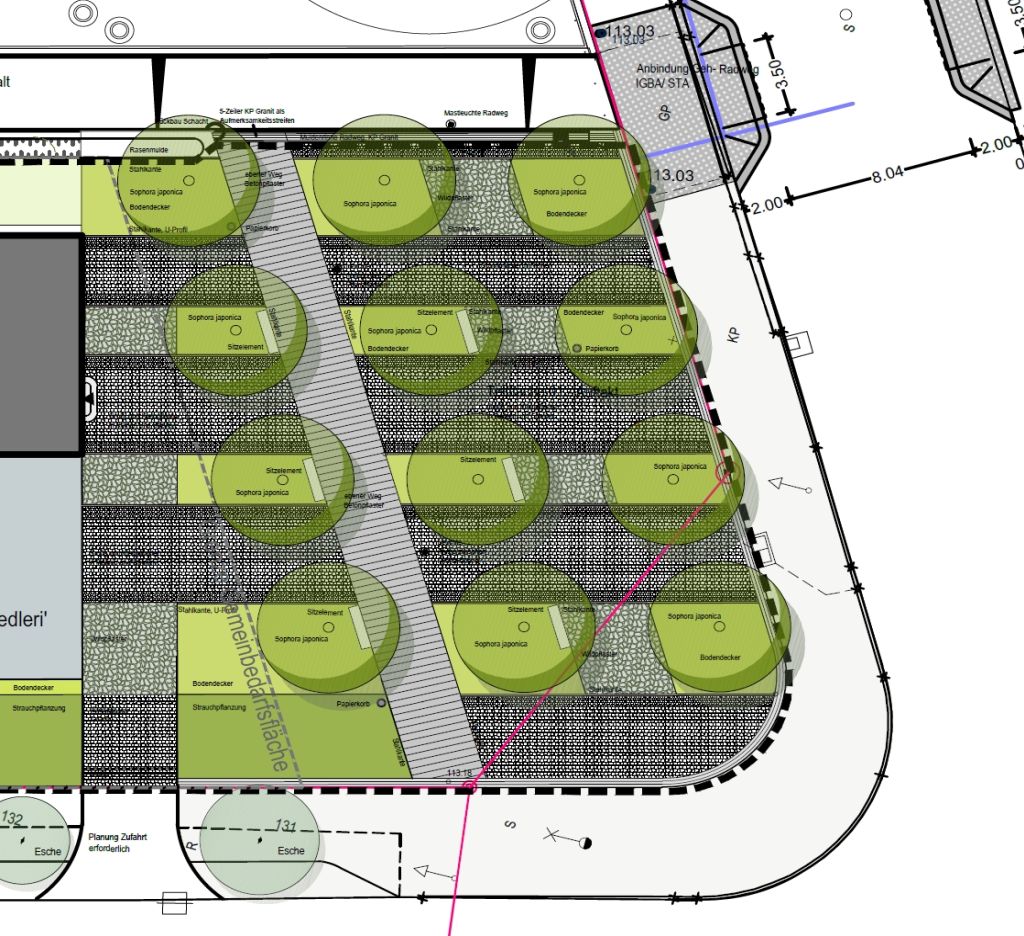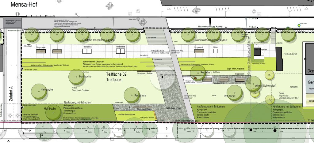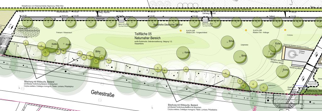 Im Entwurf der Grünanlage stellt die lineare Baumallee mit ihrem Alleecharakter zusammen mit dem Fuß- und Radweg das Bindeglied zwischen der öffentlichen Grünfläche und dem Schulareal dar. Sie betont die Sichtachse zwischen Eingangsbereich der öffentlichen Grünfläche und dem sog. Balkon am nordwestlichen Ende des Fuß- und Radwegs. Sie ist somit zentrales Element des Grünzugentwurfs, der mit seinen parkartigen Strukturen den Festsetzungen des Bebauungsplans Nr. 3001 entspricht.