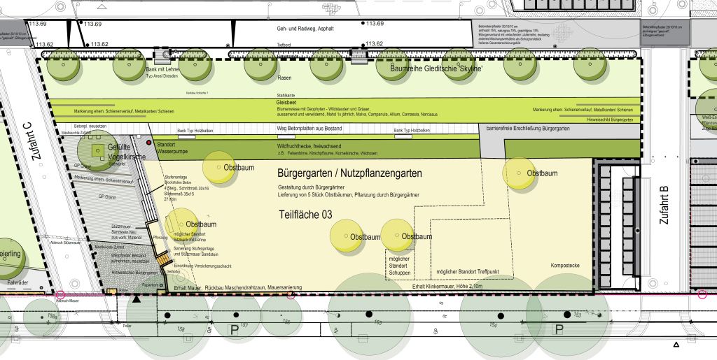 Momentan laufen die Vorbereitungen für eine neue Grünfläche an der Gehestraße. Im Zuge der Bebauung des östlichen Bereiches mit dem Schulcampus Pieschen, soll im Westbereich entlang der Gehestraße ein 30 Meter breiter und 550 Meter langer öffentlicher Grünbereich entstehen.