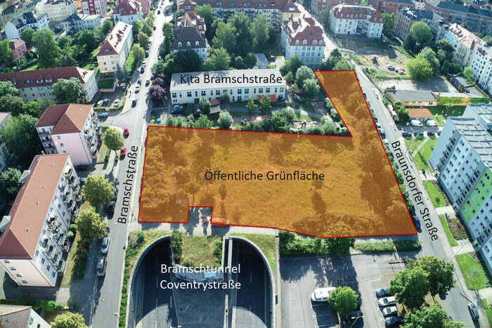 Die Landeshauptstadt Dresden möchte die öffentliche Grünfläche oberhalb des Bramschtunnels an der Coventrystraße im Stadtteil Löbtau weiter aufwerten. Bereits im Jahr 2022 ergab eine Online-Umfrage zur Neugestaltung des Gebietes, dass sich die Menschen Plätze und Räume mit mehr Grün entlang der Verkehrstrassen wünschen.