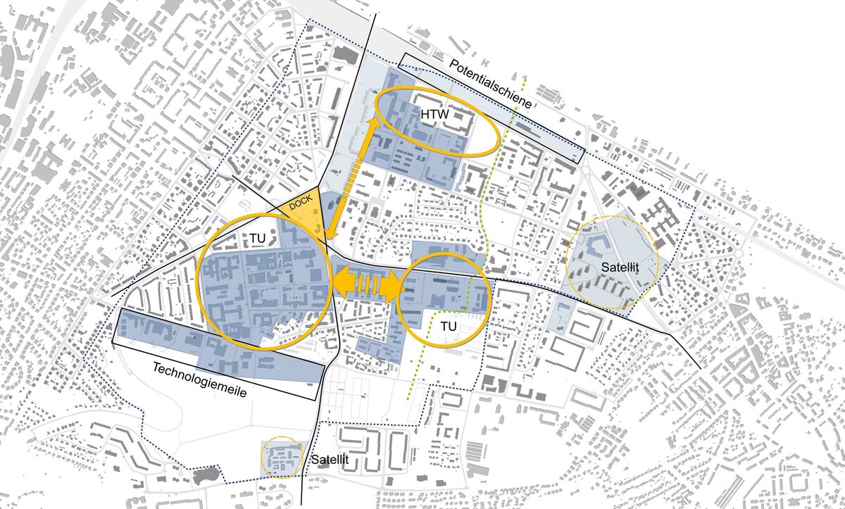 Die Entwicklung der deutlich kleineren HTW (zirka 5000 Studierende) erfolgt derzeit in überschaubaren und qualitätsvollen Einheiten im Einzugsbereich des Hauptbahnhofs und in enger Orientierung zum Bestand. Die raumgreifende baulich-räumliche Entwicklung der TU (zirka 35 000 Studierende) und ihrer benachbarten Institute hingegen sucht derzeit ihre neuen Standorte entsprechend der raschen und günstigen Verfügbarkeit freier Flächen. Periphere Lagen, südlich der Nöthnitzer Straße auf der „grünen Wiese“ oder auch im Osten des Untersuchungsgebietes jenseits der Teplitzer Straße werden derzeit baulich entwickelt oder hierzu in Aussicht genommen. Es steht zu befürchten, dass sich das Gefüge der Südvorstadt künftig ohne ein flexibles räumliches Konzept mehr und mehr zu einer räumlich und funktional zerfließenden Gemengelage wandeln könnte, in der nicht nur die Universität, sondern auch die Substanz der verbleibenden Wohnquartiere ihre jeweils „kritische Masse“ und ihren räumlichen Zusammenhalt verlieren. Eine maßvolle urbane Konzentration und Verdichtung sind jedoch die Voraussetzung für eine gedeihliche und adäquate Nahversorgung und Belebung des gesamten Stadtteils.