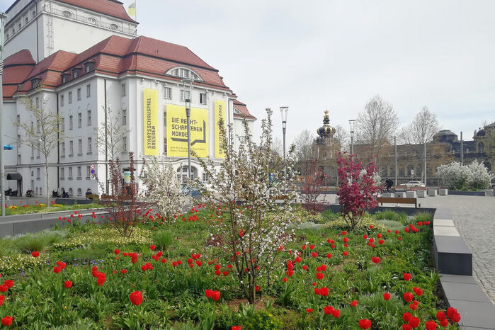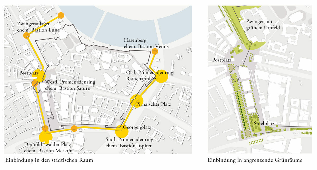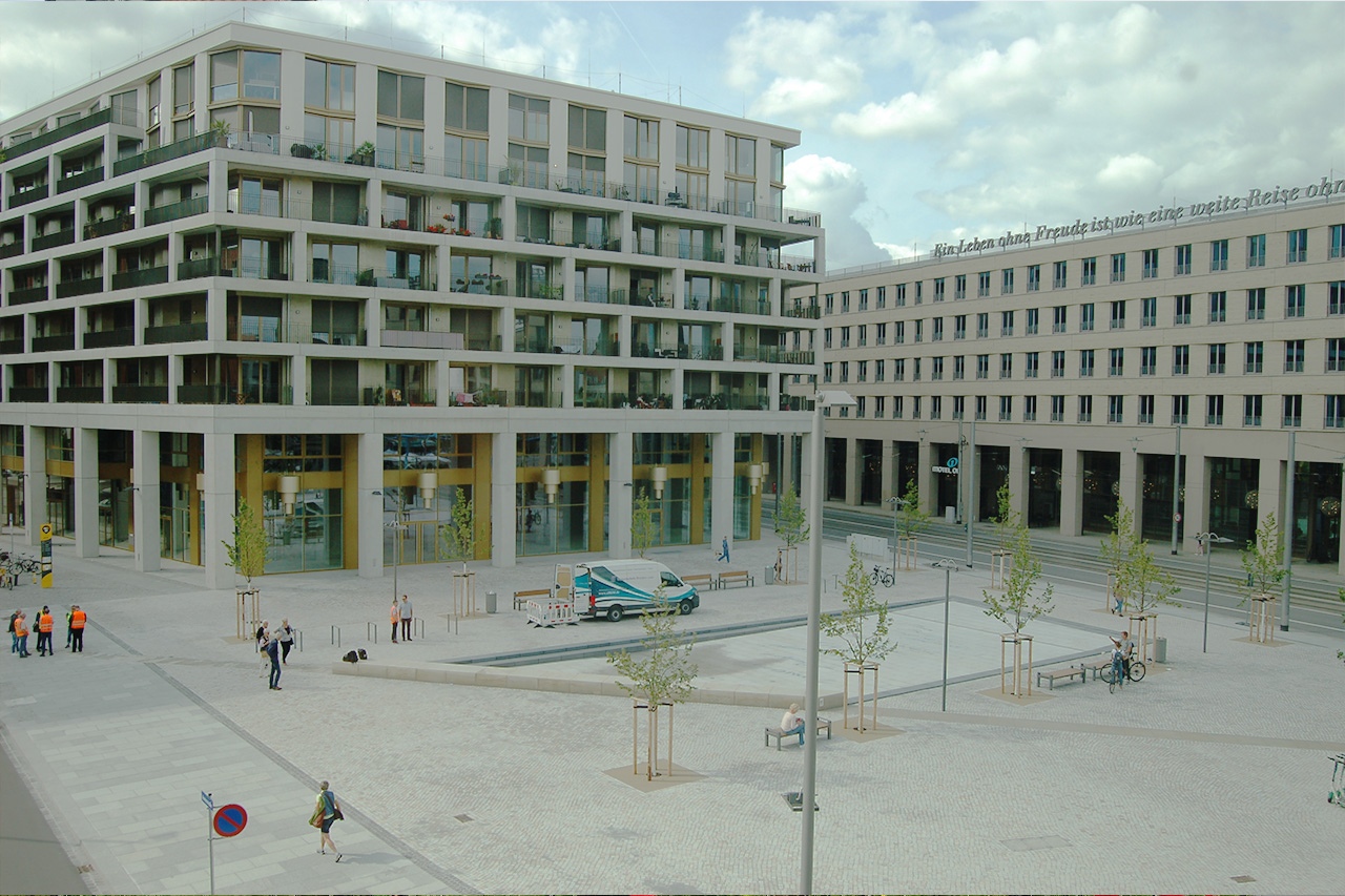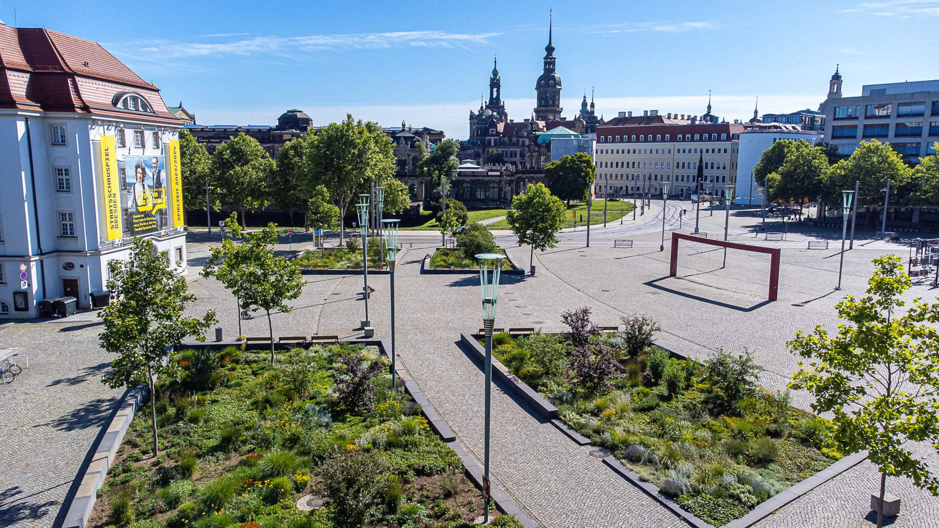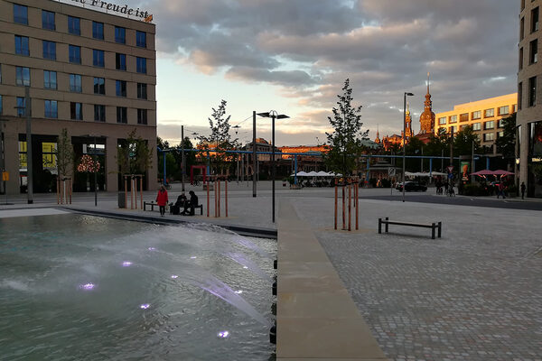 Dresdner Stadtgeschichte wird mit dem nachempfundenen Verlauf der historischen Stadtbefestigung, der Bastion „Saturn“ wieder erlebbar. Zur Aufenthaltsqualität tragen 13 Baumpflanzungen, das anspruchsvolle Wasserspiel und das Kunstprojekt „blau in blau“ bei. Neben der neu gestalteten Platzfläche entstand in der Annenstraße ein weiterer Mobilitätspunkt.