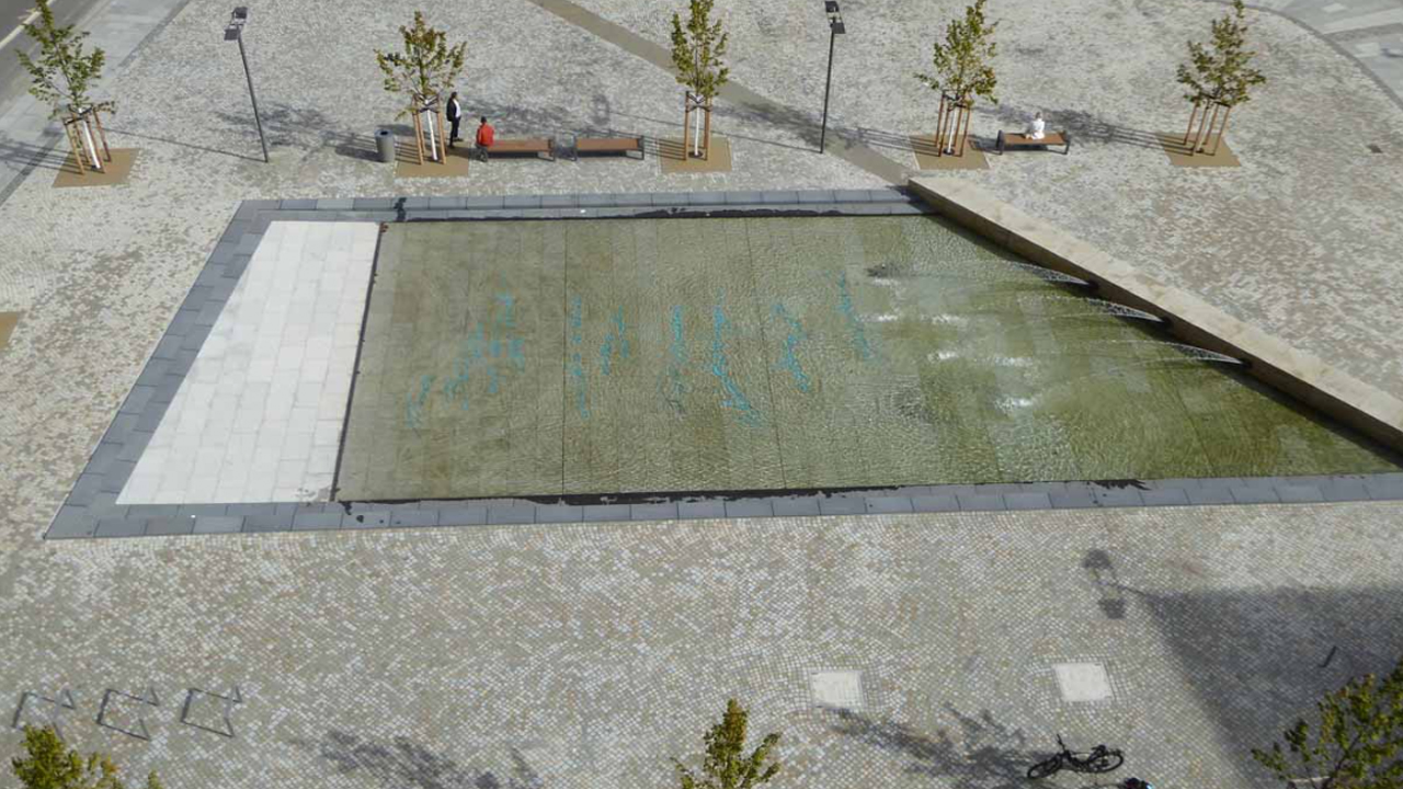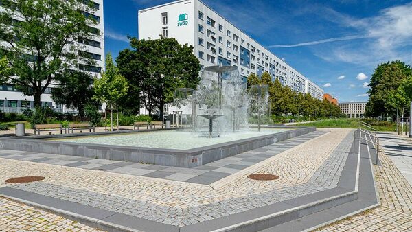 Das Wasserbecken der Brunnenanlage am Postplatz Dresden mit der Sandsteinmauer an der südlichen Einfassung und den daraus sprudelnden Wasserzuläufen sollen an den ehemaligen Festungsgraben mit der Bastion Saturn erinnern.