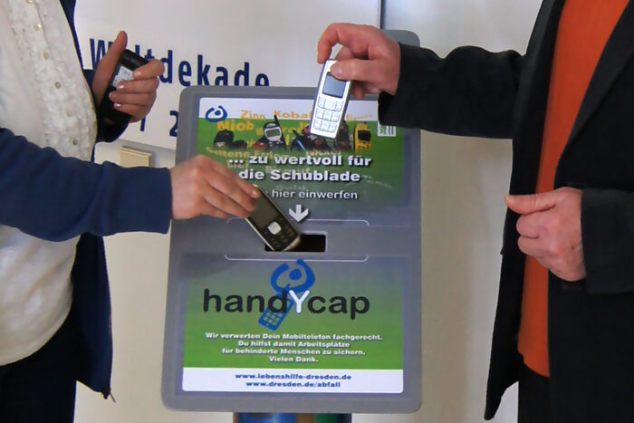 Bitte geben Sie alte Mobiltelefone in einen der mehr als 40 stadtweit aufgestellten Sammelbehälter des Projektes „HandYcap" ein. Mit der Abgabe Ihrer alten Geräte unterstützen auch Sie die Arbeit des Vereins. Außerdem helfen Sie damit der Umwelt.
