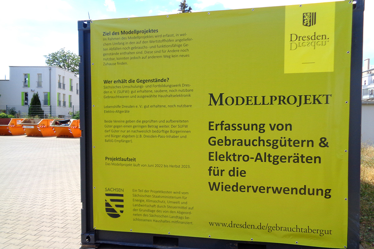 Von Juni 2022 bis Dezember 2023 wurde die Annahme von Gebrauchtwaren im Rahmen eines Modellprojektes auf den Wertstoffhöfen Friedrichstadt und Kaditz getestet und ist nun ein Dauerangebot. Der Großteil der Projektkosten wird vom Sächsischen Staatsministerium für Energie, Klimaschutz, Umwelt und Landwirtschaft durch Steuermittel auf der Grundlage des von den Abgeordneten des Sächsischen Landtags beschlossenen Haushaltes mitfinanziert.