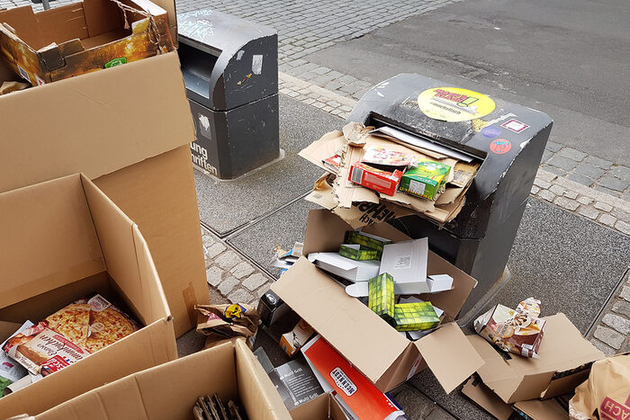 - Ein Aufkleber an den Containern für Altpapier soll die Nutzer erinnern, vor der Eingabe Pappen zu zerkleinern und flach zu machen.