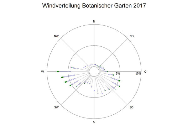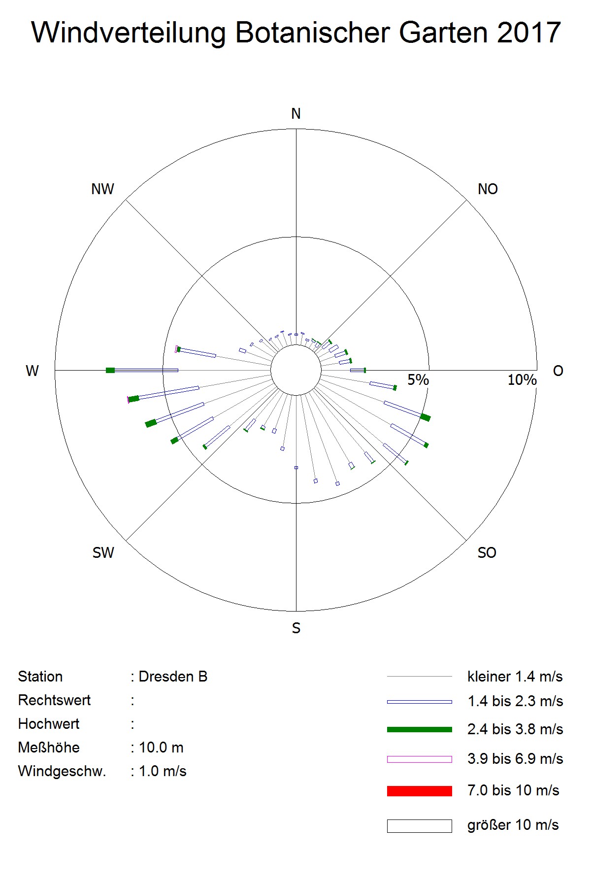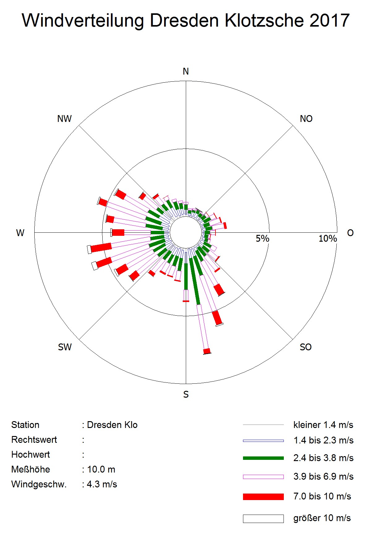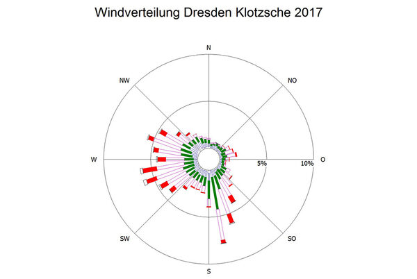 Auf den Hochebenen kommt der Wind entsprechend der Hauptanströmung über Mitteleuropa vorwiegend aus West-Südwest und Ost-Südost. Durch das Elbtal wird die Windrichtung jedoch beeinflusst. Die Luftströmung wird hier parallel zur Elbe abgelenkt. So entstehen in Elbnähe zwei Windrichtungsmaxima: ein stärkeres bei südöstlichen, ein etwas schwächeres bei westlichen Richtungen. Verstärkt wird der südöstliche Wind durch den Talabwind aus dem Erzgebirge und dem hauptsächlich im Winter auftretenden „Böhmischen Wind“.