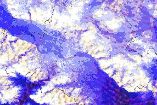 Vor Sonnenaufgang erreichen die Kaltluftströme und -schichtdicken ihre größte Mächtigkeit. Ein bedeutender Kaltluftstrom füllt nun das gesamte Elbtal aus.