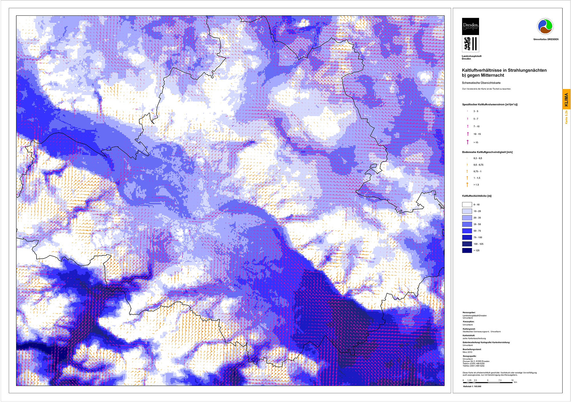Auch auf den das Stadtgebiet umgebenden, unbebauten Hochflächen wird nach Sonnenuntergang Kaltluft gebildet. Ab einer gewissen Mächtigkeit fließt diese dem Relief oder Gefälle folgend Richtung Stadtgebiet. So bilden sich entlang der Täler rasch die ersten Kaltluftabflüsse. Im Laufe der Nacht vereinen sich kleinere Ströme zu größeren Abflüssen, den sogenannten Kaltluftabflussbahnen. Bis Mitternacht ist das gesamte Elbtal mit Kaltluft gefüllt.