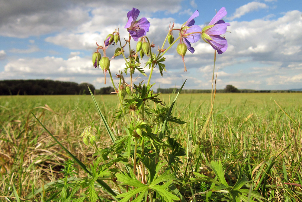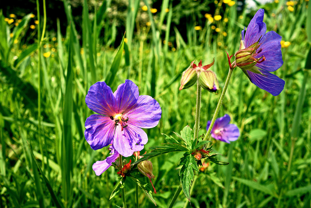 Von Juni bis in den August hinein blüht auf den Elbwiesen eine auffällige Pflanze mit wunderschöner blauvioletter, leicht rötlicher Blüte – der Wiesenstorchschnabel. Diese ausdauernde krautige Pflanze wird 20 bis 80 Zentimeter hoch. Am Stängel und den Blattstielen befinden sich deutlich wahrnehmbare Härchen. Die Blätter sind tief handförmig in sieben Teile geteilt und die Blüten mit fünf Kronblättern paarweise angeordnet.