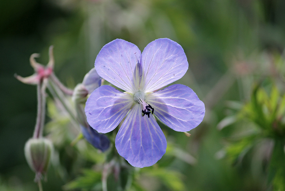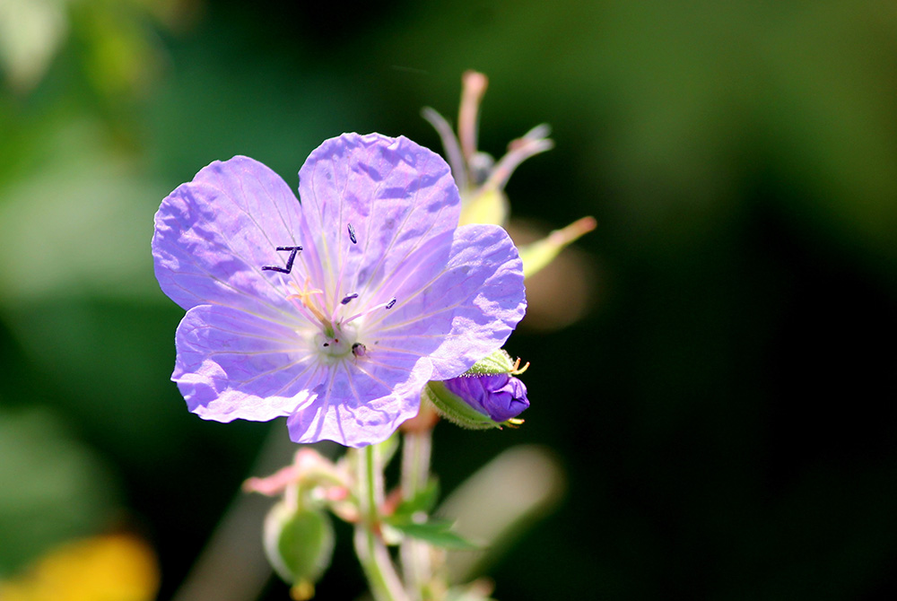 Die hübsche Wiesenblume wird gern von Bienen und Schwebfliegen bei der Nahrungssuche aufgesucht. Bereits nach zwei Tagen sind die zarten Blüten verwelkt, doch folgen schon bald die nächsten Blütenknospen. Doch woher kommt der auffällige Name? Wiese ist naheliegend, aber Storchschnabel?