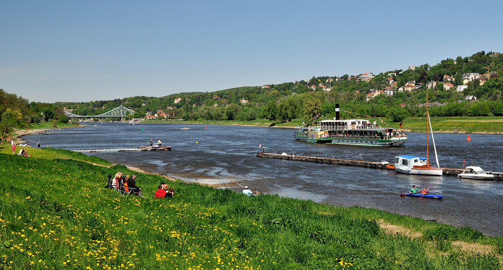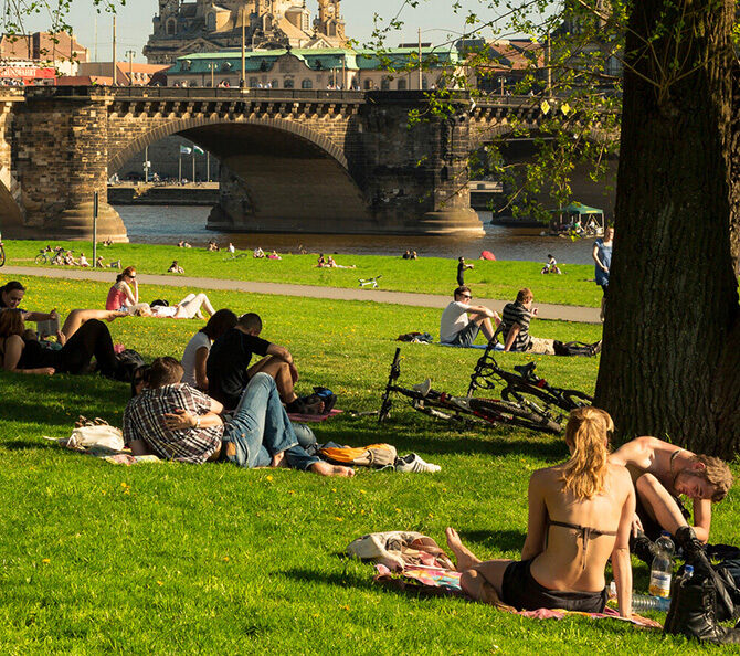 Tau hängt glänzend an feinen Spinnenweben, dunstiges Licht, wie es nur der September spendiert, taucht die Elbwiesen in einen Mantel aus Gold. Doch kaum erwacht die Großstadt aus ihrer nächtlichen Ruhe, verfliegt auch der morgendliche Zauber. Der Altweibersommer hält die letzten warmen Tage des Jahres bereit und lockt die Menschen an den Fluss. Nachmittags genießen Sonnenanbeter, Familien und Hundebesitzer die herrliche Landschaft an der Elbe. Auch Jogger und Radfahrer gesellen sich dazu. Abends und am Wochenende geht es an den Dresdner Elbwiesen auch mal hoch her: Picknick, Familienfeier oder ausgelassene Party – hier lässt es sich in besonderem Ambiente feiern.