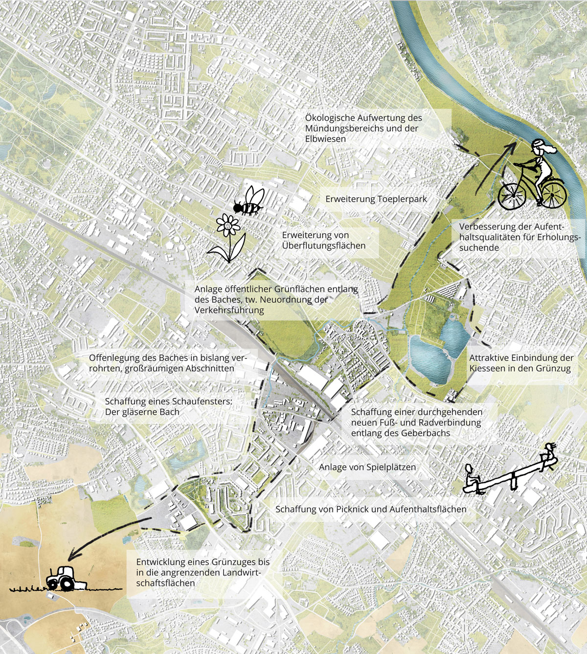 Der Grünzug Blaues Band Geberbach soll ausgehend von der Elbe entlang des Geberbachs entstehen und Prohlis als Stadtteil mit besonderen Entwicklungsbedarfen aufwerten.
