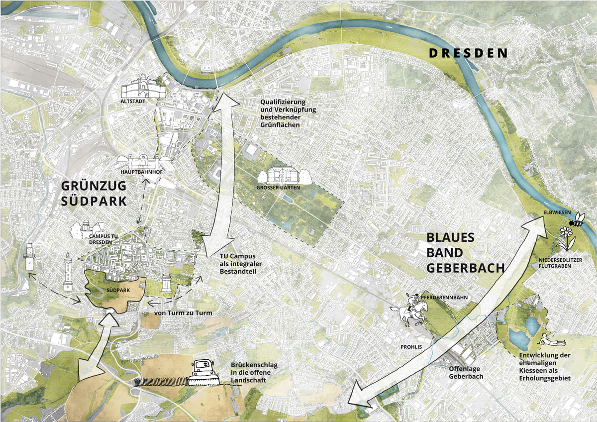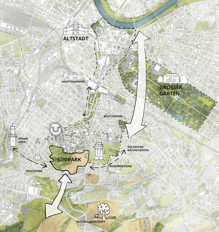 Der Grünzug Südpark führt von der Altstadt über den Großen Garten und den Campus der TU Dresden auf die Südhöhe und soll das zentrale Ausstellungsgelände der Bundesgartenschau integrieren: den Südpark.