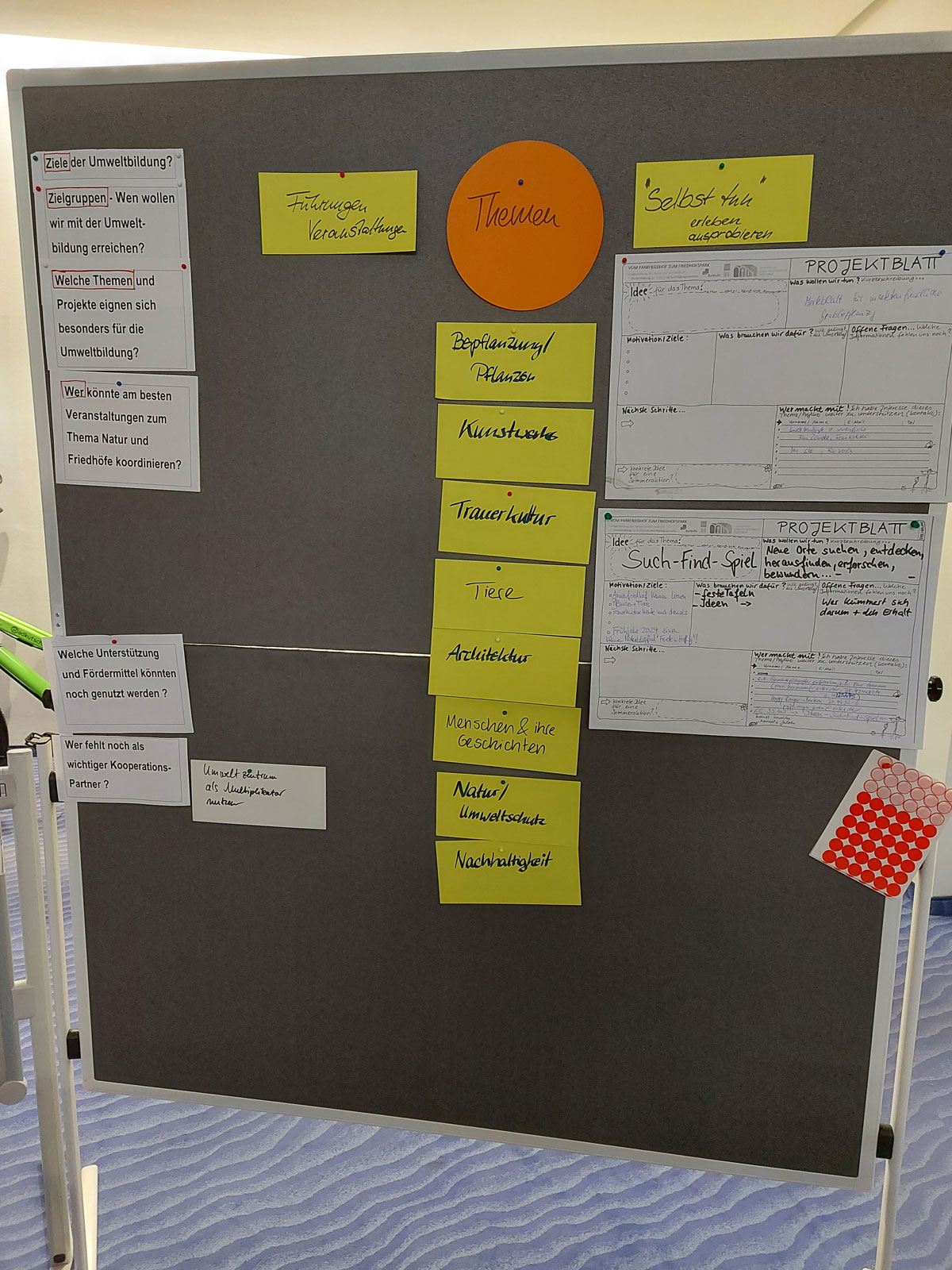 Während der Vorstellungsrunde und im Kontext mit den Fragestellungen “Warum sollten wir die Bedeutung der Friedhöfe mehr öffentlich machen?“, WER sind die Zielgruppen und WER könnte dieses Projekt entwickeln, nannte die Gruppe Kriterien für Projekte (Auswahl):