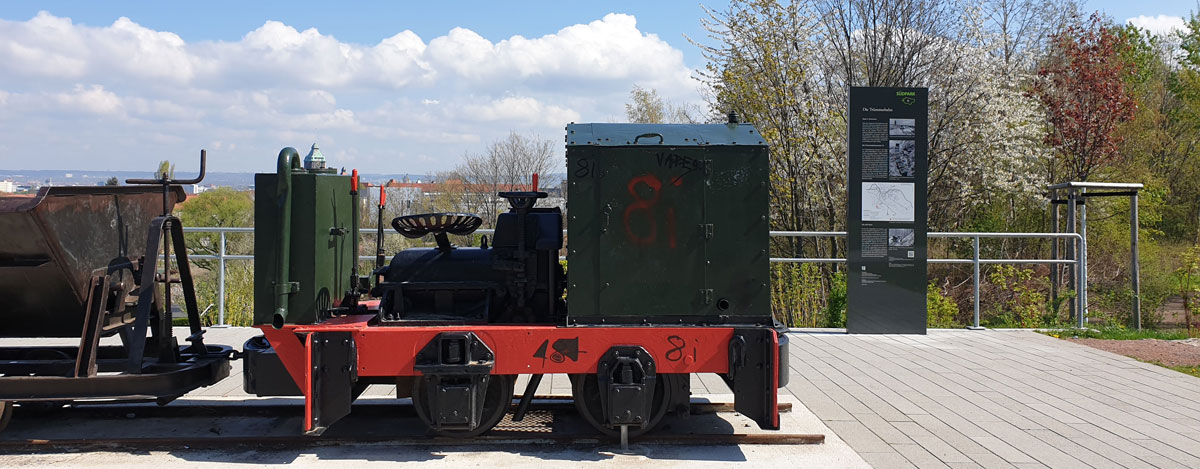 Im westlichen Bereich am Eingang Passauer Straße wurde am 21. Juli 2021 eine Lokomotive mit drei Loren als Schauobjekt aufgestellt. Die Bahn erinnert daran, dass nach 1945 die Trümmer auf Schienen aus der Stadt in die noch offenen Lehmgruben am Dresdner Südhang gebracht wurden. Der Verlauf der 2019 neu angelegten Ost-West-Wegeachse im Park ist identisch mit der Strecke der ehemaligen Trümmerbahn.
