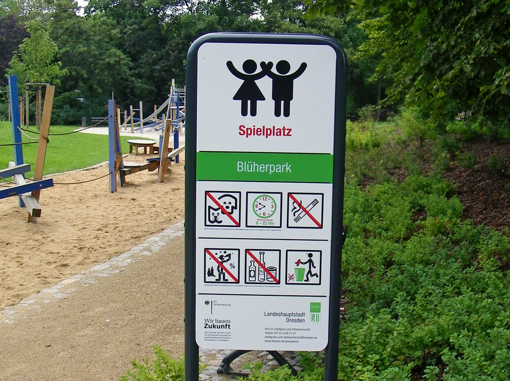 Um die Sicherheit für alle Nutzer zu verbessern, gibt es auf allen kommunalen Spielplätzen eine einheitliche Beschilderung mit Nutzerhinweisen und Regeln.
