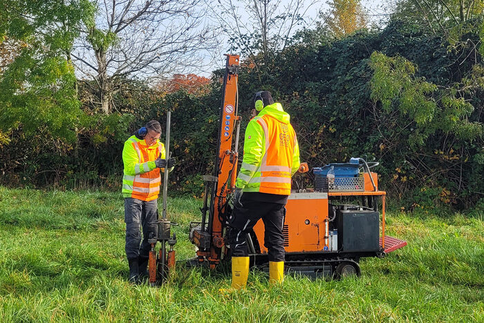 In den Stadtteilen Reick, Dobritz, Tolkewitz, Seidnitz und Laubegast wurde der Baugrund im 1. Quartal 2025 getestet. Dafür entnahmen Fachleute mit Bohrgeräten und Schürfwerkzeugen Proben aus der Erde, die anschließend fotografiert, dokumentiert und teilweise auch im Labor untersucht wurden. Damit soll herausgefunden werden, wie der Untergrund aufgebaut ist, auf dem das Projekt entstehen soll. Die Ergebnisse sind Grundlage für den Bau von Brücken, Rad- und Fußwegen, Straßen sowie Gewässern. Ziel der Arbeiten ist es zu ermitteln, wie sich Unterbau und Fundamente bemessen und das Gewässerbett abdichten lassen und, ob Schadstoffe im Boden enthalten sind.