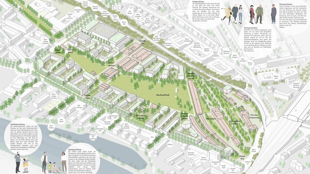 "Zentraler Gedanke des Projekts ist der Neustadtpark – eine große zusammenhängende Grün- und Freifläche, die sich von Norden mittig durch das Areal legt und sich nach Süden hin bis zum historischen Areal des Leipziger Bahnhofs konisch aufweitet. Daraus entwickeln sich hohe strukturelle Qualitäten, da alle neuen Baufelder einen direkten Bezug zu dem grünen Band haben.