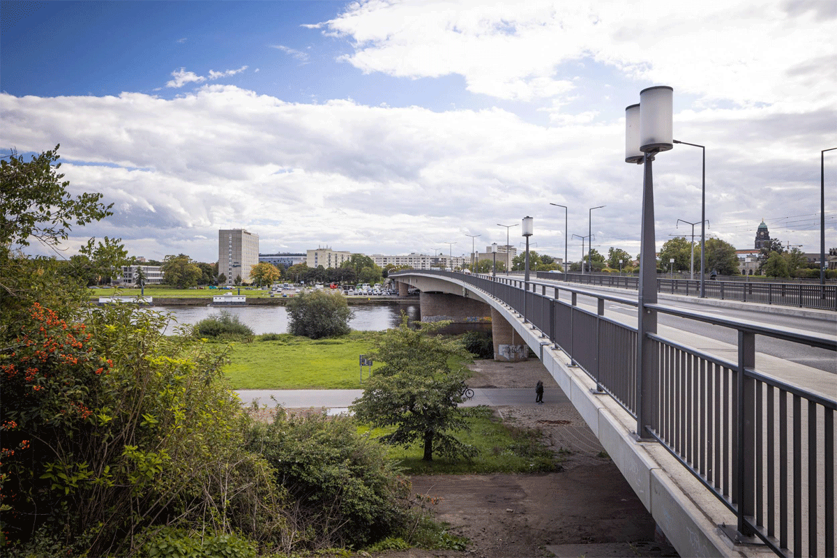 Bei den Luftangriffen am 13. Februar 1945 blieb die Brücke zunächst unzerstört. Beim Einmarsch der Roten Armee am 7. Mai 1945 wurden vier Bögen der Brücke von deutschen Truppen gesprengt. Die Beschädigungen waren so groß, dass man sich nach Kriegsende entschied, die Brücke stückweise abzureißen. Erst 1967 begannen die Arbeiten für eine neue Elbquerung an alter Stelle. Sie wurde bis 1971 als dreizügige Spannbetonbrücke errichtet und überspann auf rund 400 Metern die Elbe. Über der Schifffahrtsrinne hatte sie eine Spannweite von 120 Metern. Bis 1991 trug sie den Namen Dr.-Rudolf-Friedrichs-Brücke nach dem ersten Dresdner Oberbürgermeister und erstem sächsischen Ministerpräsidenten nach dem zweiten Weltkrieg. 1991 erhielt sie ihren ursprünglichen Namen zurück.