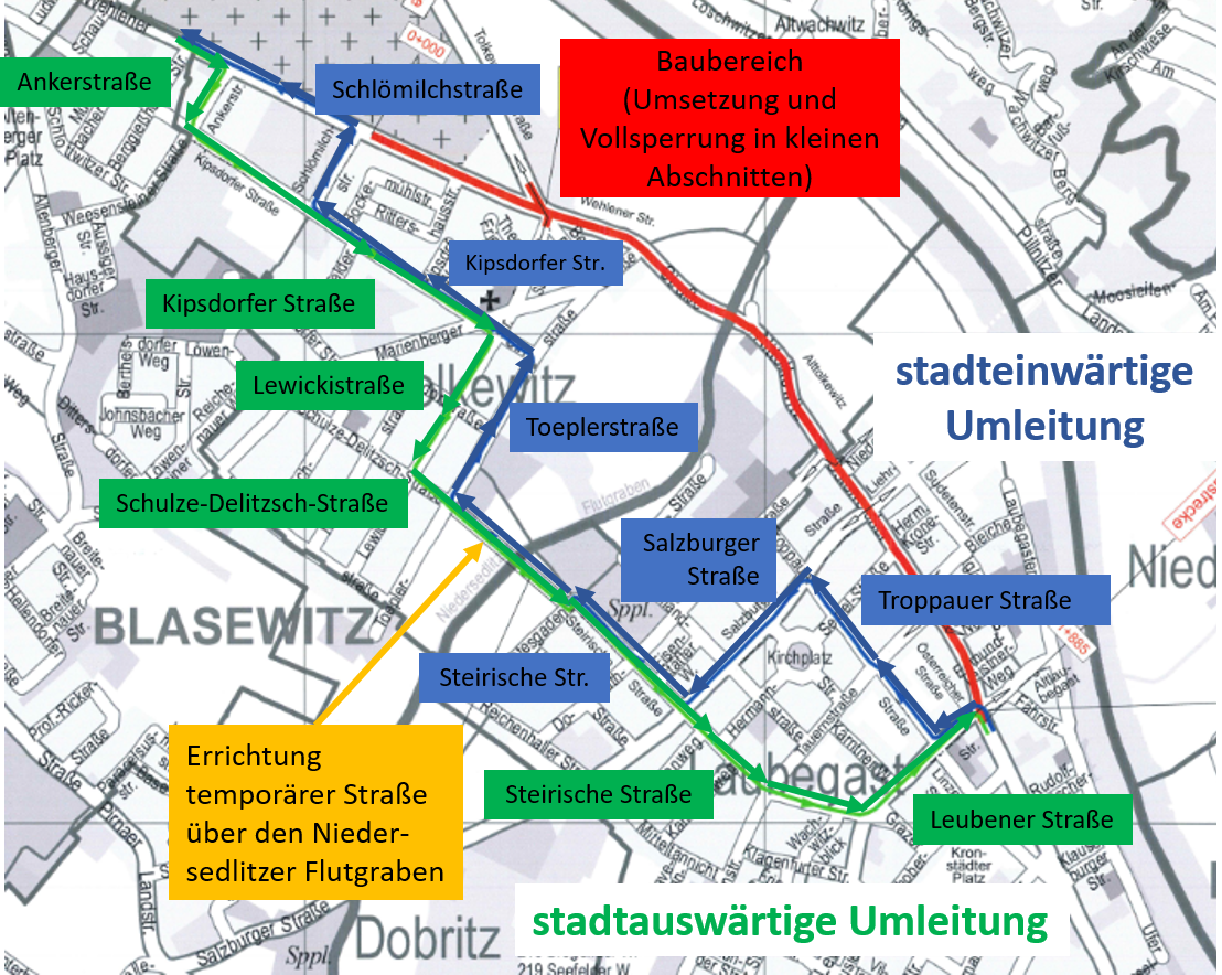 Im Zusammenhang mit dem Bauvorhaben werden auch die Straßenbeleuchtung, Ampelanlagen, die Straßenentwässerung sowie die Ver- und Entsorgungsunternehmen erneuert. Der Brückenüberbau der sich im Planungsgebiet befindlichen Brücke im Niedersedlitzer Flutgraben wird im Zuge der Baumaßnahme unter Beibehaltung der Unterbauten neu errichtet.