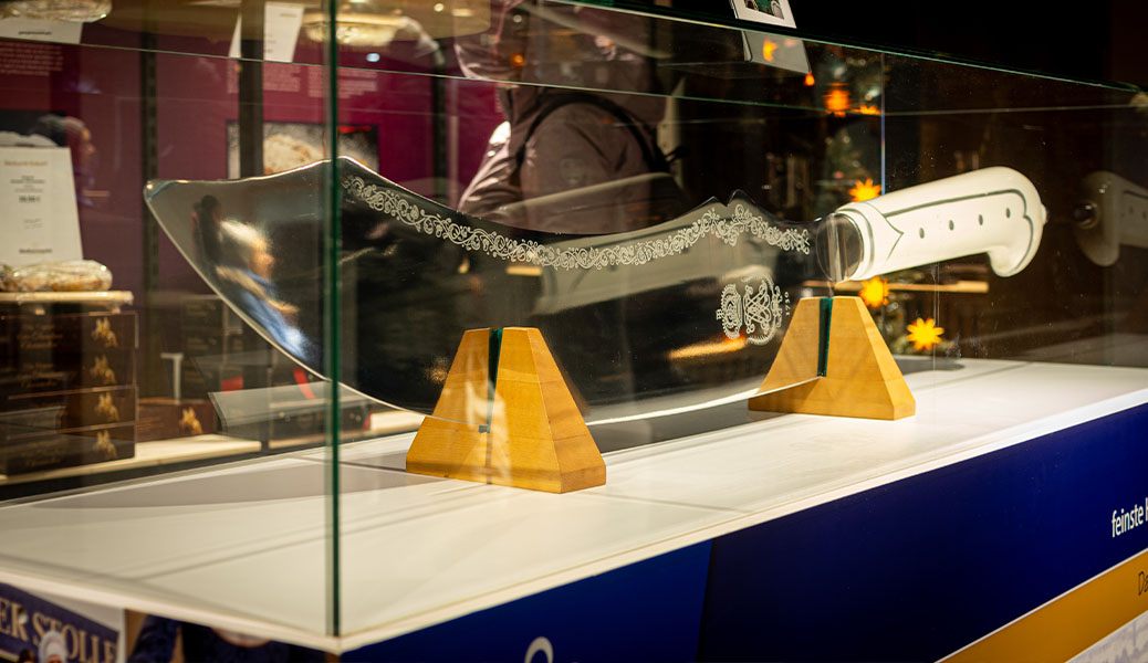Ein Highlight und ein beliebtes Fotomotiv ist das im Verkaufsraum ausgestellte Original Riesen-Stollenmesser, bekannt vom jährlichen Stollenfest des Dresdner Striezelmarktes.