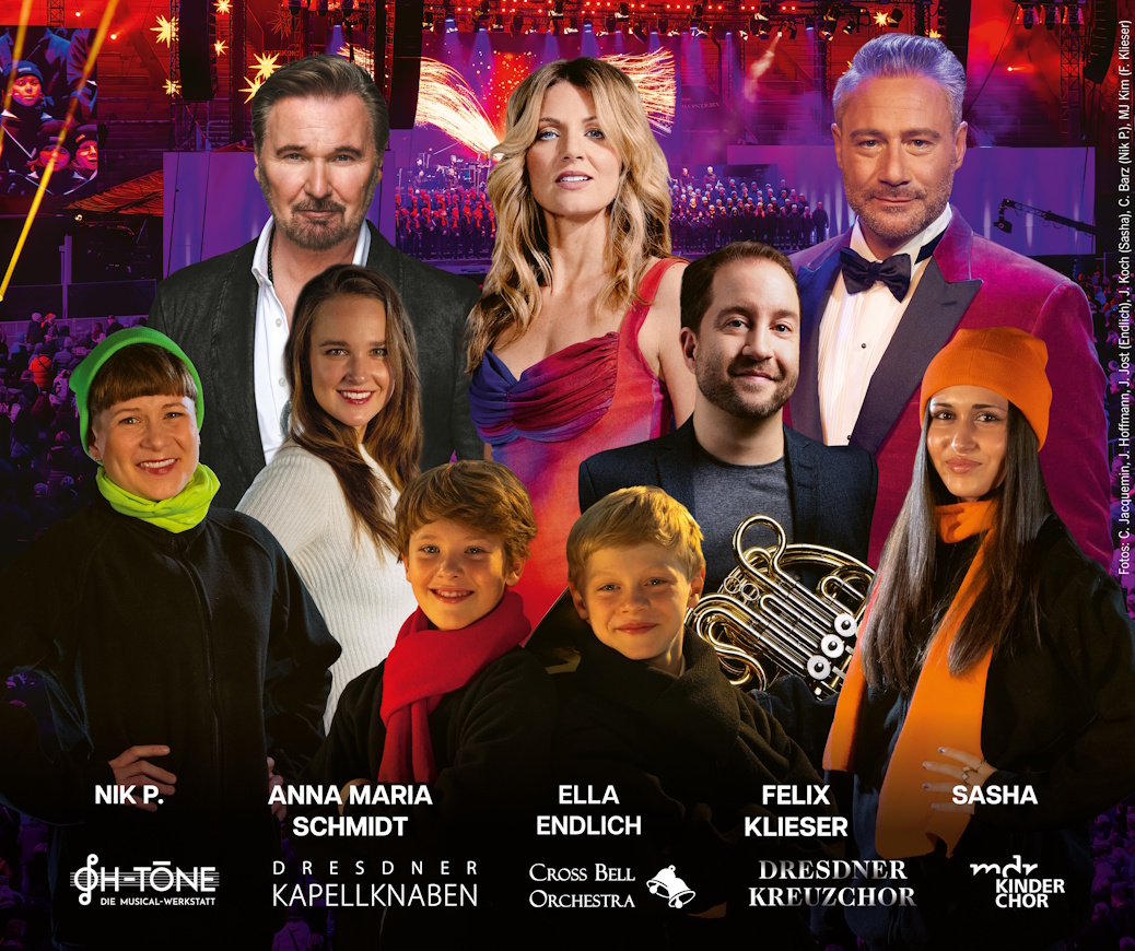 - Chöre – Dresdner Kreuzchor, Dresdner Kapellknaben, MDR-Kinderchor und die Musicalwerkstatt Oh-Töne bringen festliche Chorklänge in die Arena.