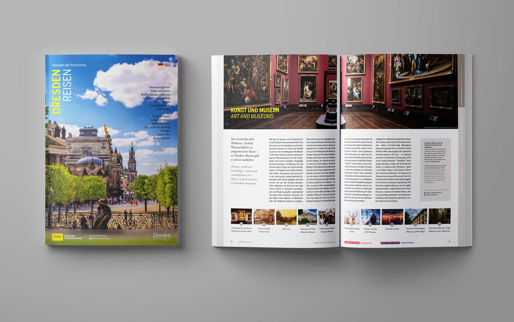 In dieser hochwertigen Broschüre finden Sie touristische Informationen zu Sehenswürdigkeiten, Museen, Veranstaltungshighlights und Erlebnisangeboten. Neben zahlreichen Reise- und Übernachtungsangeboten in Dresden und Umgebung – auch speziell für Reisegruppen – enthält sie einen detaillierten Lageplan.