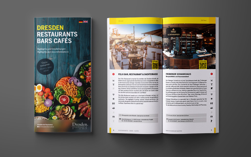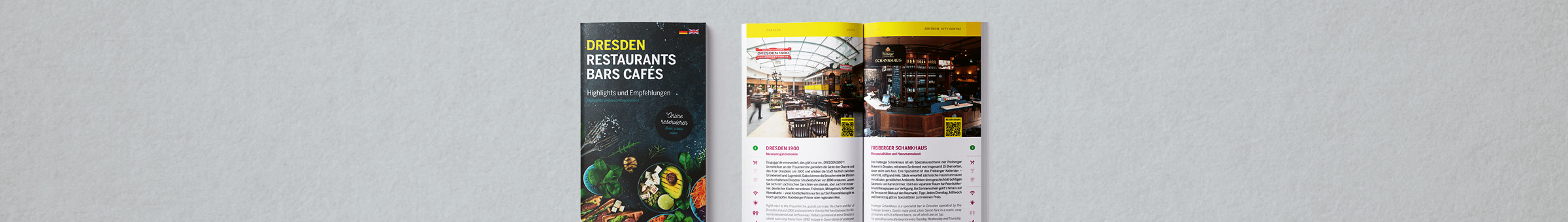 Freuen Sie sich auf die kulinarische Vielfalt in den Restaurants, Bars und Cafés der Stadt. In der Dresdner Altstadt, entlang der Elbe und im gesamten Stadtgebiet erwartet Sie eine Vielfalt moderner und klassischer Gastronomie mit regionalen Spezialitäten oder internationaler Küche. Das Heft bietet Ihnen Empfehlungen für alle Tageszeiten: Genießen Sie ein opulentes Frühstück, Mittagessen in gemütlichem Ambiente, feinste Kuchen zum Kaffee, frische Gerichte am Abend oder einen nächtlichen Cocktail an der Bar.