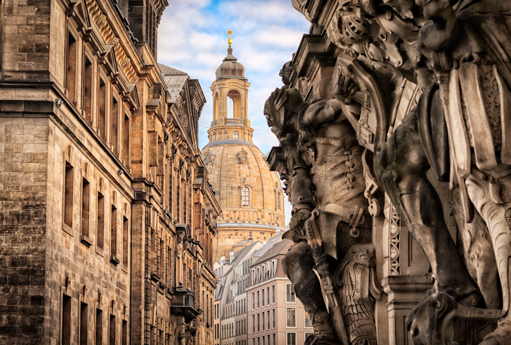 Das Sakralbauwerk wurde von George Bähr zwischen 1726 und 1743 erbaut. Die als „Steinerne Glocke“ bekannt gewordene Kuppel war dabei nicht nur die Krönung der Stadtsilhouette, sondern auch eine architektonische Herausforderung. Nach dem Luftangriff auf Dresden am 13. Februar 1945 stand die Frauenkirche noch genau einen Tag – und stürzte dann in sich zusammen, weil der Sandstein den hohen Temperaturen nicht gewachsen war. Die symbolträchtige Ruine der Frauenkirche blieb für ein halbes Jahrhundert unberührt.