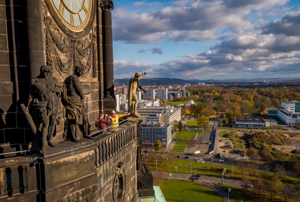 Oben angekommen, erwartet Sie ein echtes Highlight: eine Fotoausstellung der Deutschen Fotothek zeigt historische Ausblicke vom Rathausturm – vom eleganten Vorkriegs-Dresden über die Zerstörung 1945 bis zum Wiederaufbau. Diese fotografische Zeitreise lässt sich direkt mit dem heutigen Stadtbild vergleichen – ein einzigartiges Erlebnis am Originalstandort.