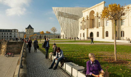 Nach Plänen des Stararchitekten Daniel Libeskind wurde das historische Arsenalgebäude mit einem Neubau erweitert, der in Form eines transparenten Keils die spätklassizistische Fassade durchbricht und damit bereits Innovation assoziiert.