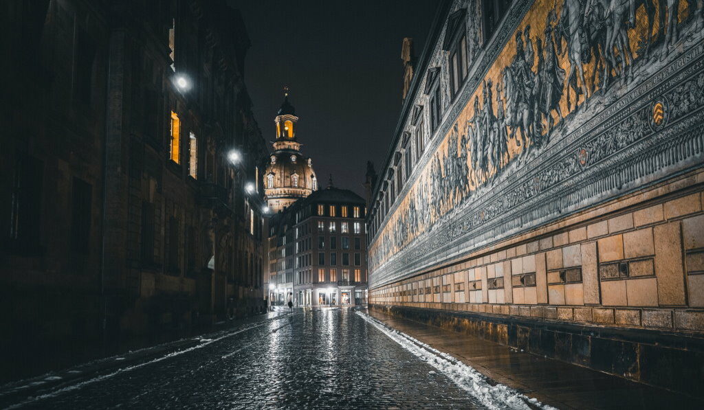 Beim Fürstenzug handelt es sich um ein 101 Meter langes Wandbild aus Meissener Porzellanfliesen. Dargestellt sind die Herrscher des Hauses Wettin als Reiterzug. Die außergewöhnliche Fassade erstreckt sich vom Schlossplatz entlang des Residenzschlosses in Richtung Neumarkt.