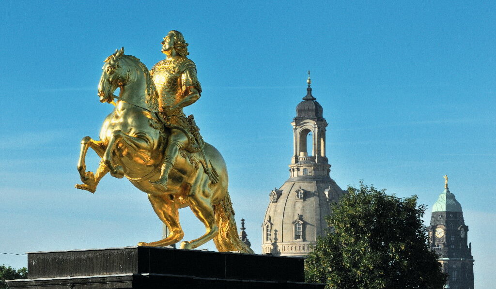 Das in Kupfer getriebene Reiterstandbild des sächsischen Kurfürsten und polnischen Königs August des Starken befindet sich auf der Neustädter Elbseite. Es zeigt den berühmten sächsischen Kurfürsten im antiken Gewand auf sein polnisches Königreich zureitend.