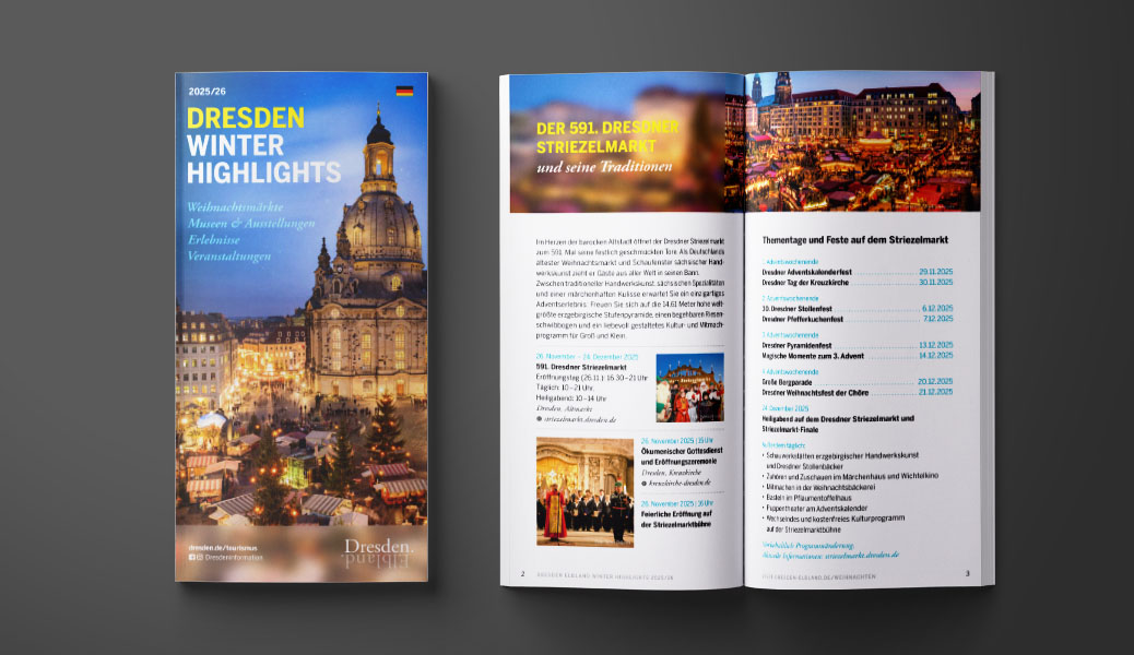 Das Heft erhalten Sie in der Dresden Information in der QF Passage an der Frauenkirche und im Hauptbahnhof oder Sie entdecken die neue Ausgabe des Heftes zur Weihnachtssaison 2025 jetzt online.