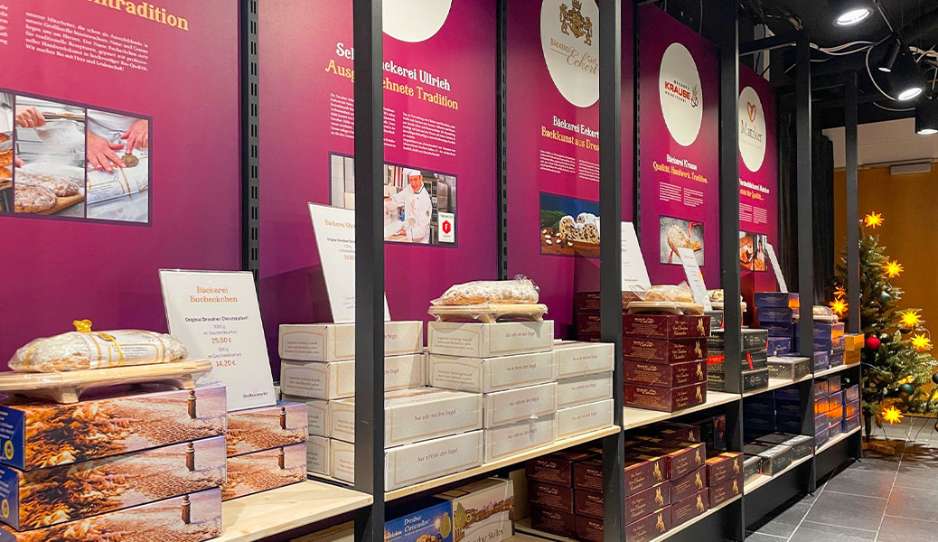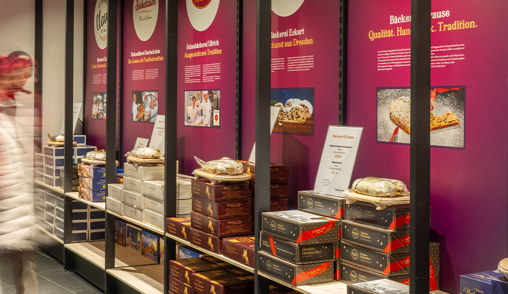 Weihnachtliche Genussmomente direkt vis-à-vis der Dresden Information in der QF Passage: Hier gibt es in der Vorweihnachtszeit Dresdner Christstollen ausgewählter Dresdner Bäcker und Konditoren zum Kosten und Kaufen.