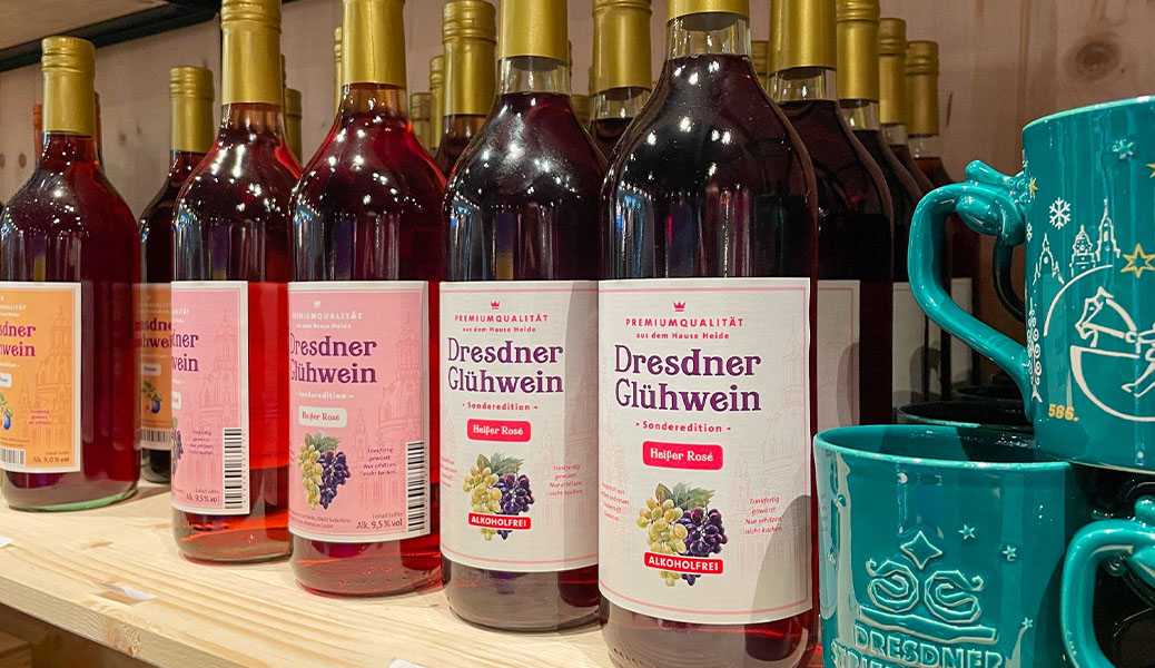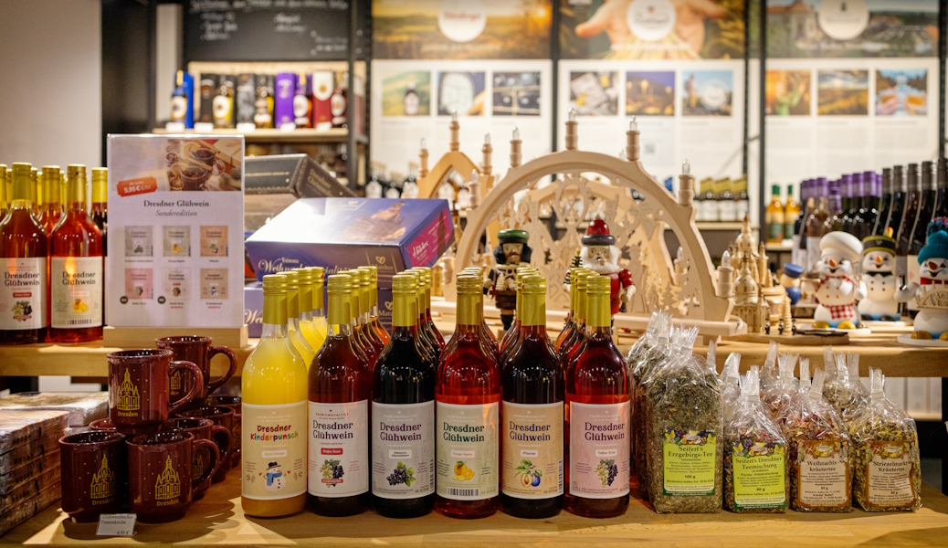 Der Stollenmarkt an der Frauenkirche bietet neben einer großen Auswahl an Sorten und Größen verschiedener Stollen auch hochwertige Stollenmesser und Stollenbrettchen, regionalen Glühwein in verschiedenen Sorten, Liköre, Striezelmarkttassen, Erzgebirgisches und weitere regionale Produkte zum Kauf an.