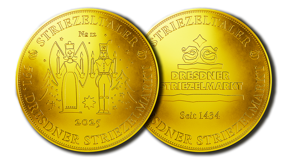 Wie in jedem Jahr erhält auch der Striezeltaler 2025 eine individuelle Gestaltung. Das mittlerweile im zwölften Jahr erscheinende Sammlerstück zeigt zwei traditionelle Lichterfiguren – Engel und Bergmann. Die kunstvoll geschnitzten Kerzenhalter stehen für die jahrhundertealte erzgebirgische Volkskunst. Engel und Bergmann symbolisieren Licht, Schutz und die enge Verbindung von Handwerk, Glaube und Tradition, die bis heute die Weihnachtszeit in Sachsen prägt.